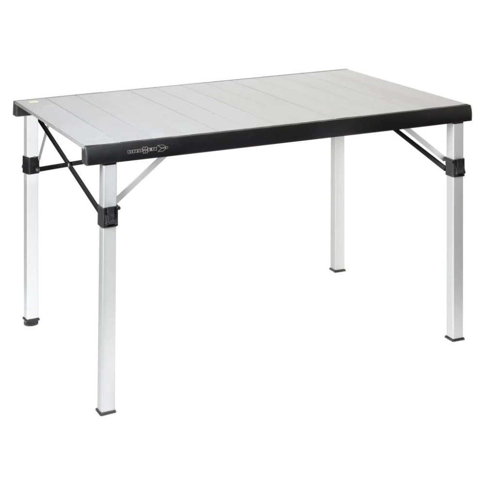 Falt- und rollbarer Aluminiumtisch mit Untergestell, das auf der klassischen Bauweise mit 4 senkrechten Standbeinen gründet. Sehr stabile Konstruktion. Die spaltenfreie Tischplatte (Gapless Table Top) wird mit einem speziellen Verriegelungsmechanismus am Tischgestell befestigt. Im Unterschied zu den klassischen Rolltischen mit Scherengestell bietet der Quadra genügend Beinfreiheit auf allen 4 Seiten. Ein Packsack für den komfortablen Transport ist im Lieferumfang enthalten.