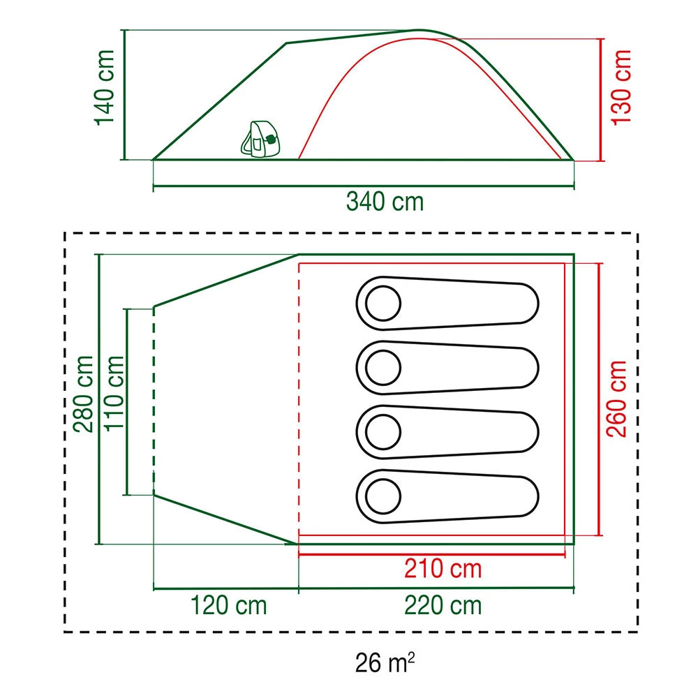 - Außenzelt: Polyester, PU-beschichtet, feuerhemmend