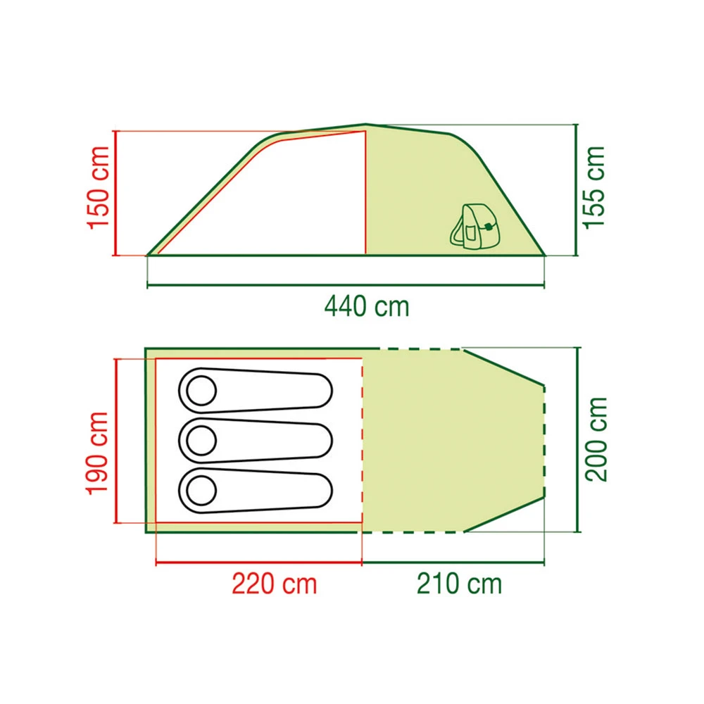 - Aufbau erfolgt zuerst über Aufstellung des Außenzeltes, danach Einhängen der Innenwand