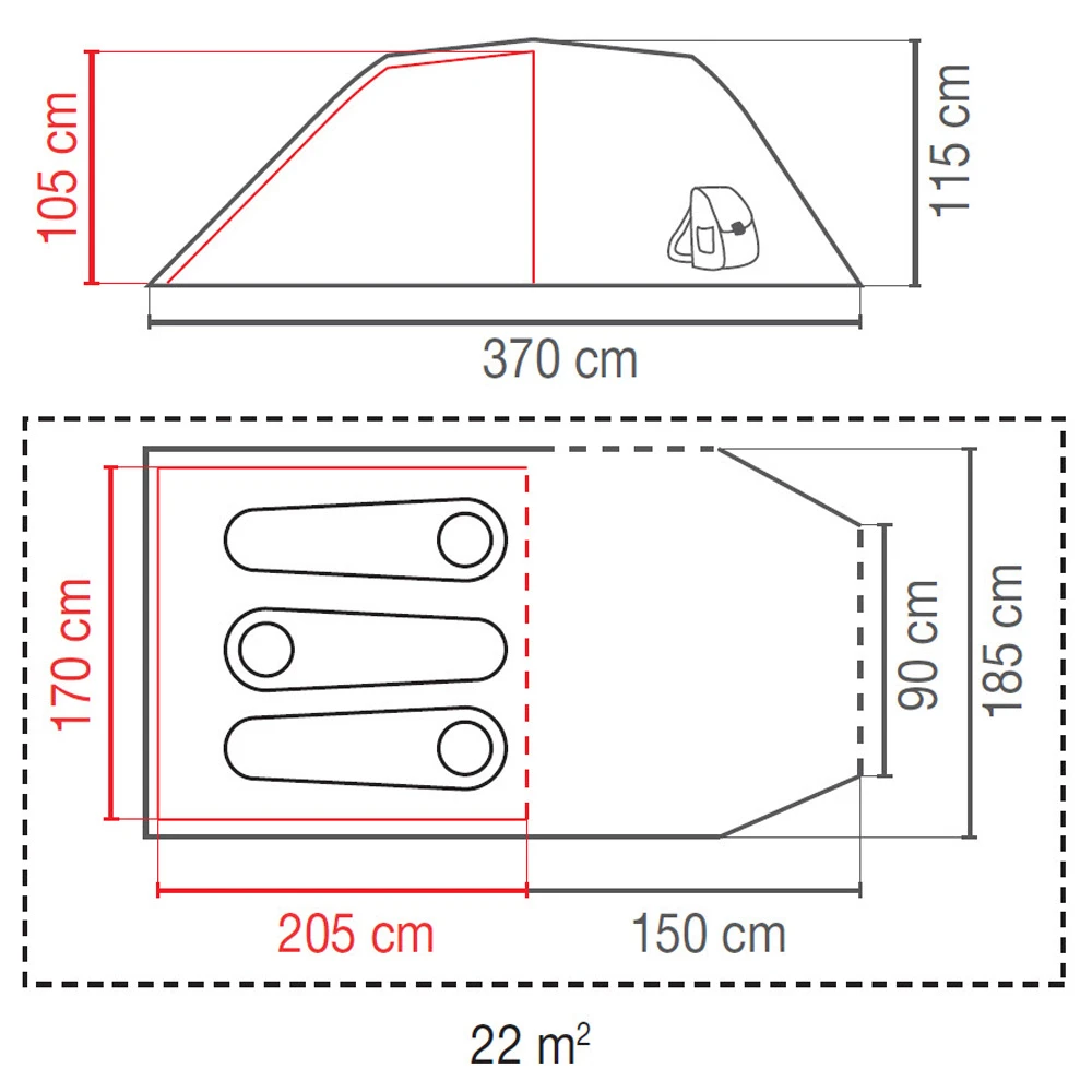- Außenzelt: Polyester, PU-beschichtet, feuerhemmend
