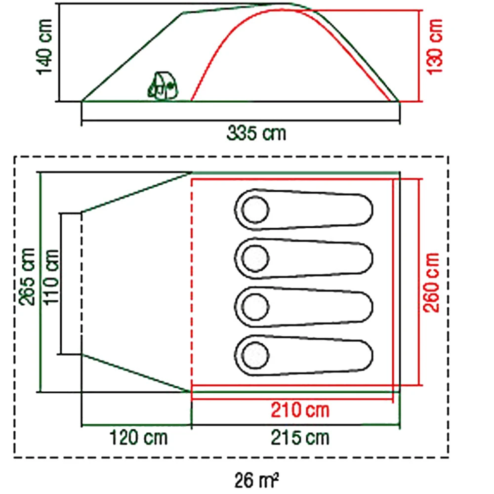 - Außenzelt: Polyester, PU-beschichtet, feuerhemmend