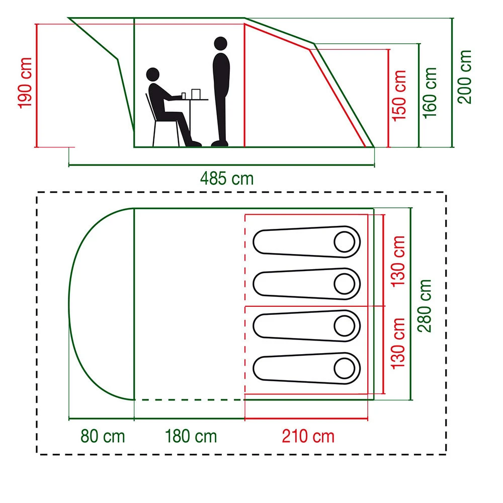 - Innenzelt: 100% Polyester, PU-beschichtet, atmungsaktiv, Moskitonetz