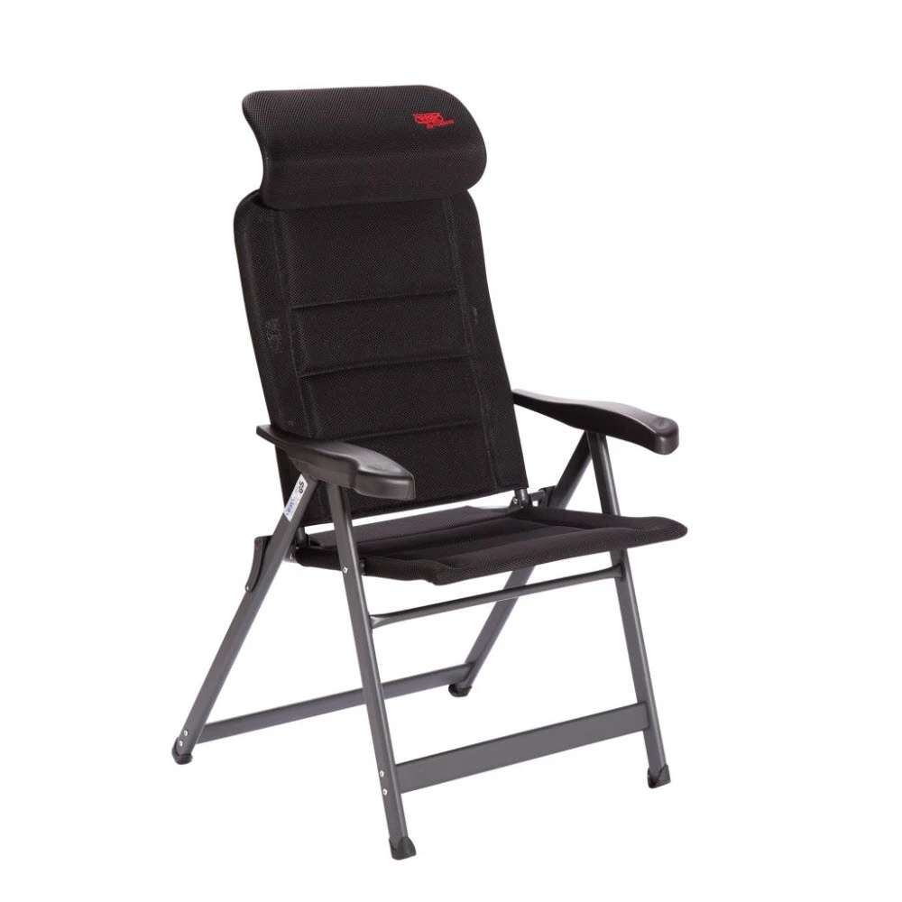 Exklusiver Campingstuhl mit ergonomisch geformter Rückenlehne und Armlehnen. Die ergonomische Kopfstütze Compact ist höhenverstellbar und spart im zusammengeklappten Zustand bis zu 16 cm ein. Der Stuhl bietet maximalen Komfort dank seiner 7-fach verstellbaren Rückenlehne und dem gepolsterten Air Deluxe 3D-Gewebe.