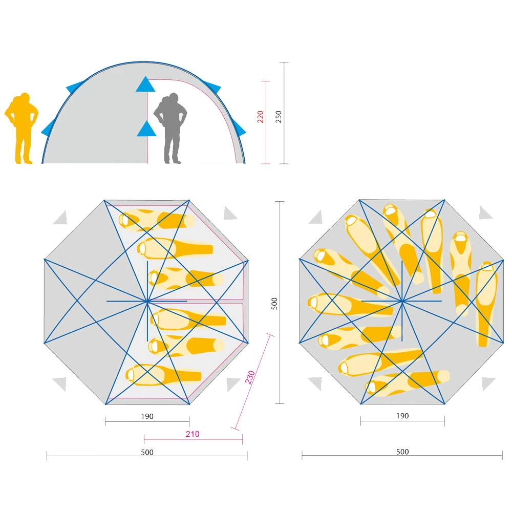 Im Inneren der gelben Kuppel können insgesamt 2 Innenzeltkabinen zu jeweils 4 unterschiedlichen Variationen eingehängt werden. Diese verschaffen komfortablen Platz für 6 bis 10 Personen inklusive Gepäckstücke. Der Vorraum bietet zudem eine 250er-Tiefe und wird demnach zum „kleinen Wohnzimmer“. In 24 Innentaschen finden die wichtigsten Kleinteile gesicherten Platz und können im Gemenge nicht verloren gehen. Desweiteren besitzt das Geodätzelt 4 Eingänge mit regensicherer Abdichtung, eine vollständig herausnehmbare Bodenschutzplane sowie einem zusätzlichen Floorsaver, was eine zusätzliche wasserdichte Unterlage für den Zeltboden darstellt. Über 8 Belüftungseinrichtungen inklusive 4 Dachventilationen mit Kamineffekt dringt zuverlässig Sauerstoff hinein und unterstützt somit das Klima sowie den Komfort.