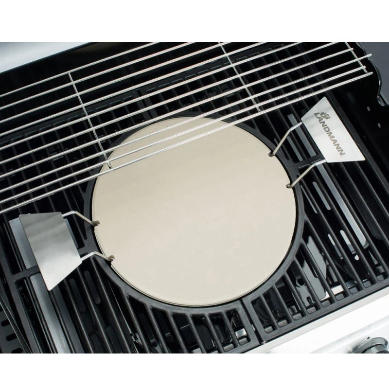 Der Stein ist aus Cordierit und hat einen Durchmesser von 30,5 cm. Dieser ist ideal geeignet für leckere Pizzen, knusprige Flammkuchen oder auch frisches Brot. Durch die praktischen Edelstahleinsätze mit Griffen lässt sich der Stein ganz einfach vom Grill nehmen. Geeignet für Holzkohle und Gasgrills und den Backofen.