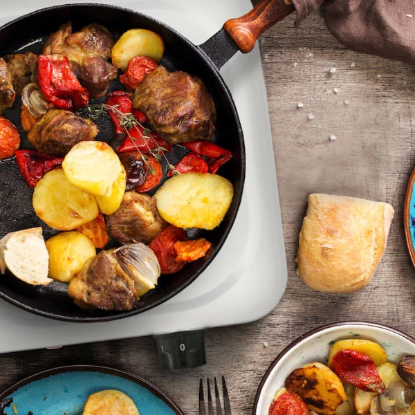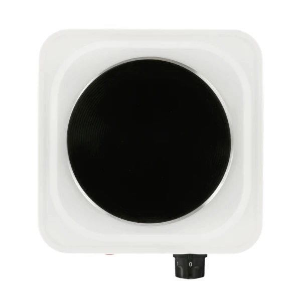 Elektrische Kochplatte mit einstellbarem Thermostat, hitzebeständigem Gehäuse, Überhitzungsschutz, roter Kontrollleuchte und Antirutsch-Füßen.
