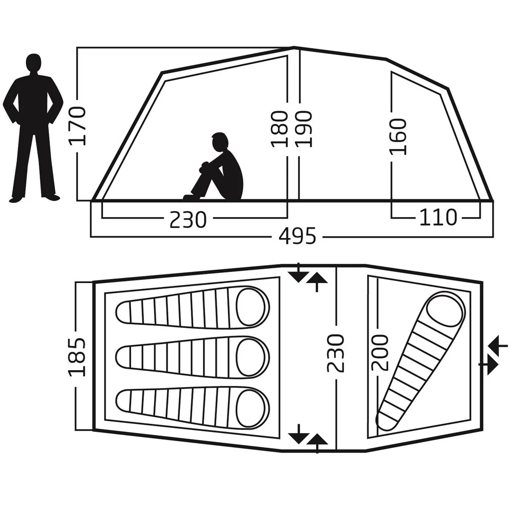 - Maße Außenzelt aufgestellt (B x L x H): 495 x 230 x 190 cm