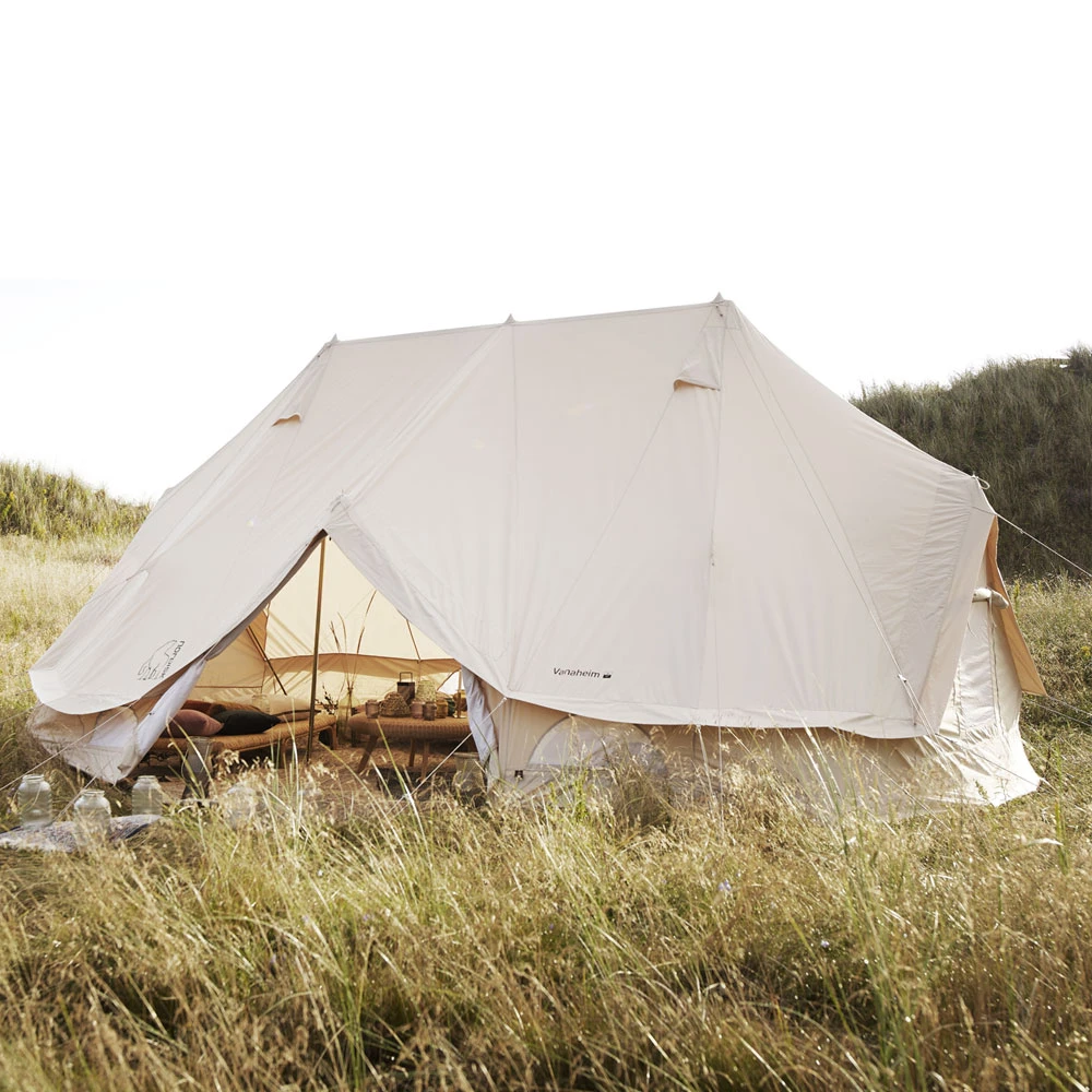 Mit einer Größe von 40 Quadratmetern bietet das Vanaheim von Nordisk ausreichend Platz für bis zu 20 Personen und eignet sich dadurch für große Familien, Gruppen und Events. Die Außenwand besteht aus schwerem und atmungsaktivem Zelttuchgewebe, wodurch ein sehr angenehmes Raumklima entsteht. Die 4 Belüftungsöffnungen am Dach runden die Luftzirkulation ab, während die D-Fenster für ausreichend Licht im Zeltinneren sorgen. Dank der üppigen Stehhöhe von 3 Metern und der Möglichkeit, die Mittelgestänge wegzulassen, bietet das Vanaheim viel Platz für einen luxuriösen Camping-Urlaub.