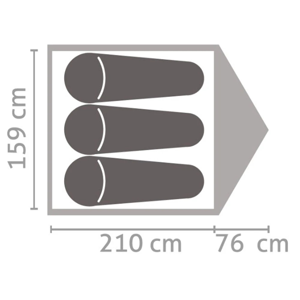 Der Schlafraum des Atlas 3 besitzt ein Maß von 159 cm Breite und 210 cm Länge. Des weiteren besitzt das 3-Personen-Zelt eine Abside, die extra Stauraum bietet.