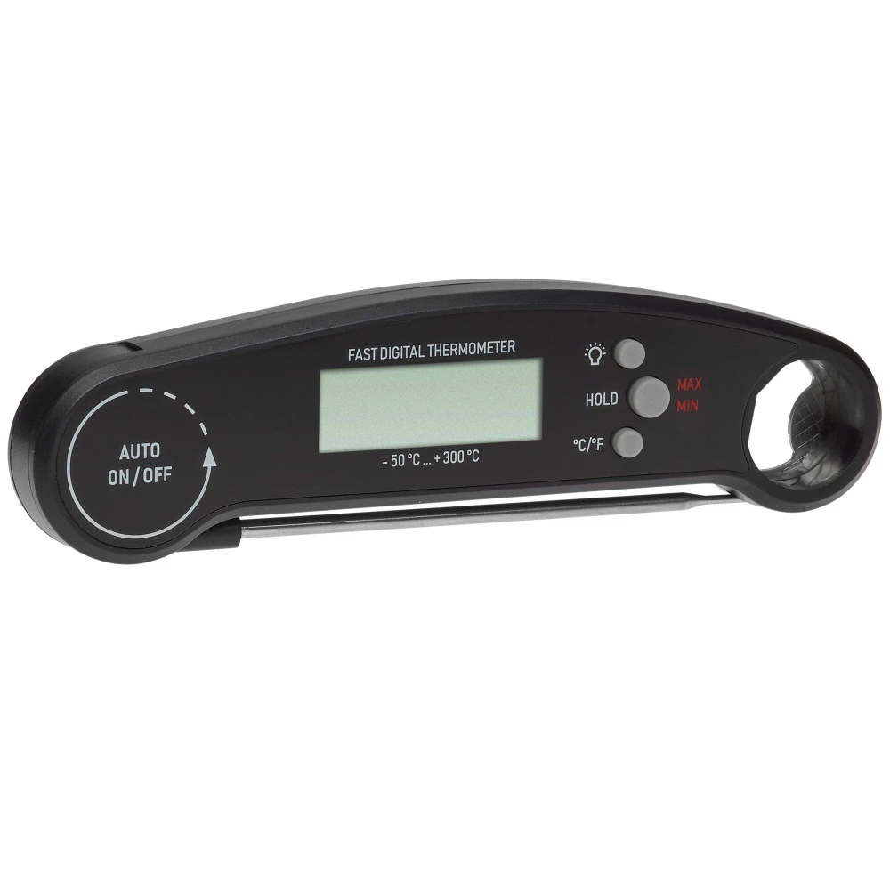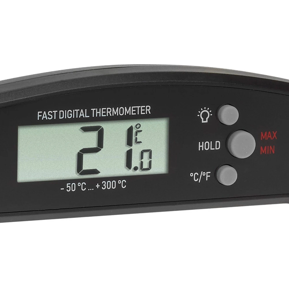 Dieses handliche Küchenthermometer zum Einklappen von TFA eignet sich ideal für die unkomplizierte Temperaturmessung von Speisen und Getränken. Nutzen Sie es als Fleischthermometer, um die Kerntemperatur beim Grillen oder Braten zu ermitteln, zum sicheren Temperatur-Check von Babynahrung, für die temperaturgenaue Zubereitung von Leckereien aus Zucker und Schokolade, beim Einkochen von Marmelade oder um die Trinktemperatur von Wein und Getränken zu überprüfen.