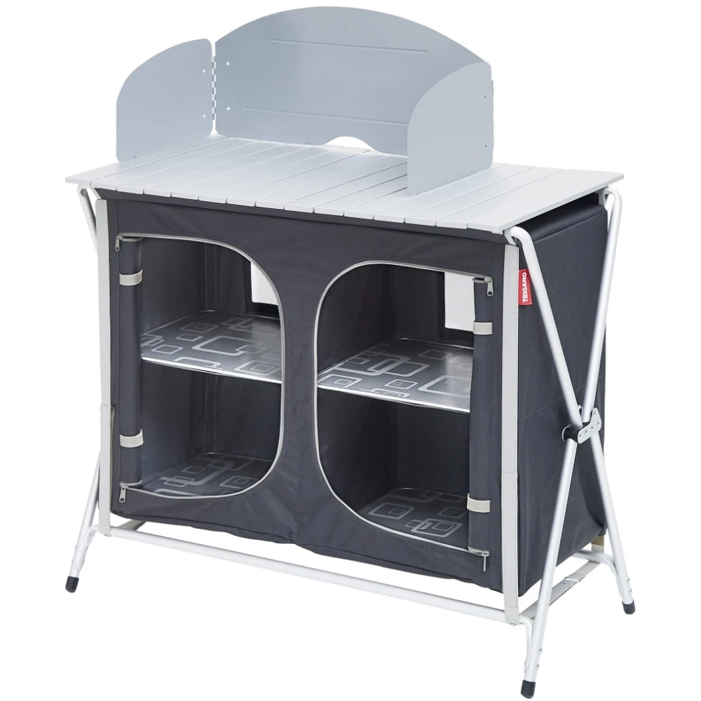 Bezug aus PVC-beschichtetem 500D Polyester (100 % Polyester), Rahmen aus Aluminium. Mit vier Ablageböden, Belüftung auf der Rückseite und Windschutz. Inklusive Tragetasche.