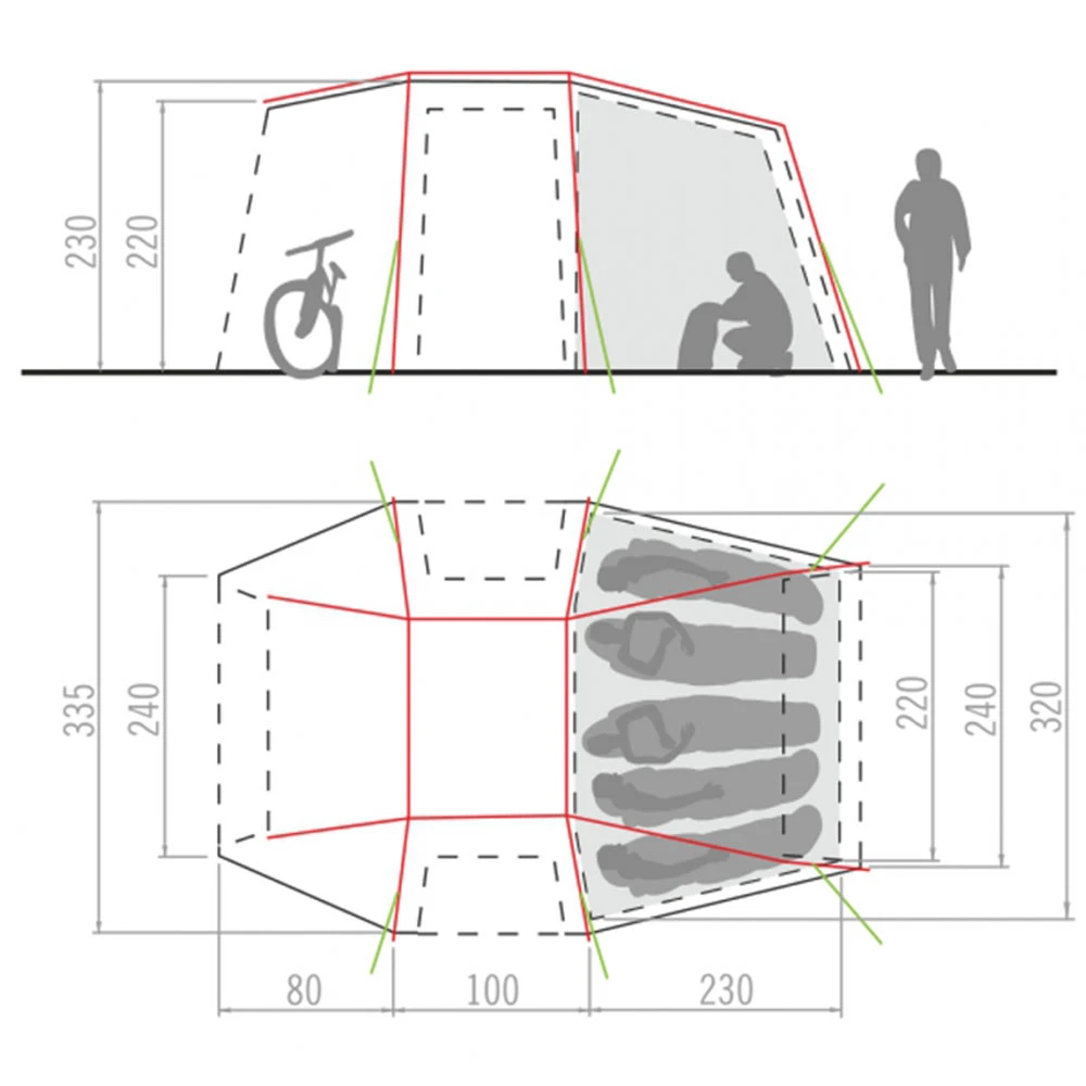 Das Drive Van XT bietet eine großzügige Zeltkonstruktion für Familien und Gruppen. Optimiertes Raumkonzept: Kuppelkonstruktion für viel Platz im Vorraum und gewichtsparende Tunnelkonstruktion in den angrenzenden Schlafkabinen.